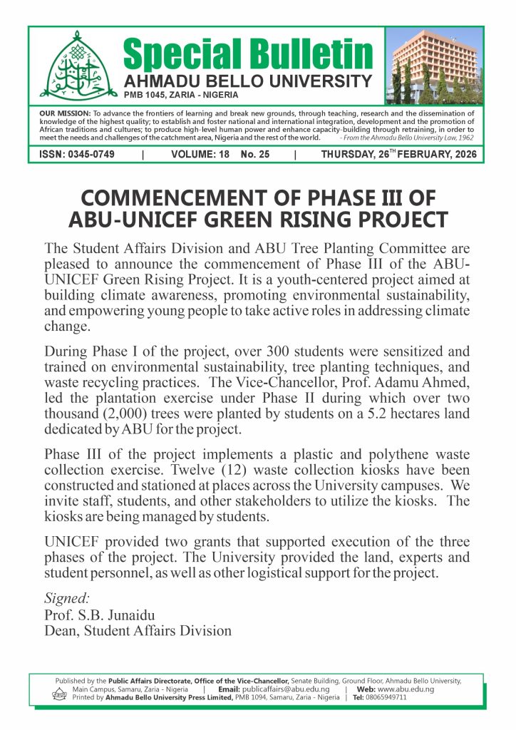 Feb 26 2026 Commencement of Phase III of ABU-UNICEF Green Rising Project Special Bulletins / February 26, 2026 / 1 minute of reading Commencement of Phase III of ABU-UNICEF Green Rising Project Read More »