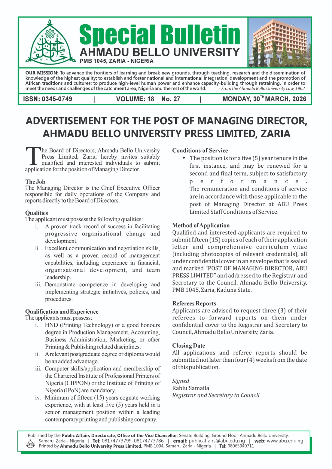 Ahmadu Bello University Zaria -