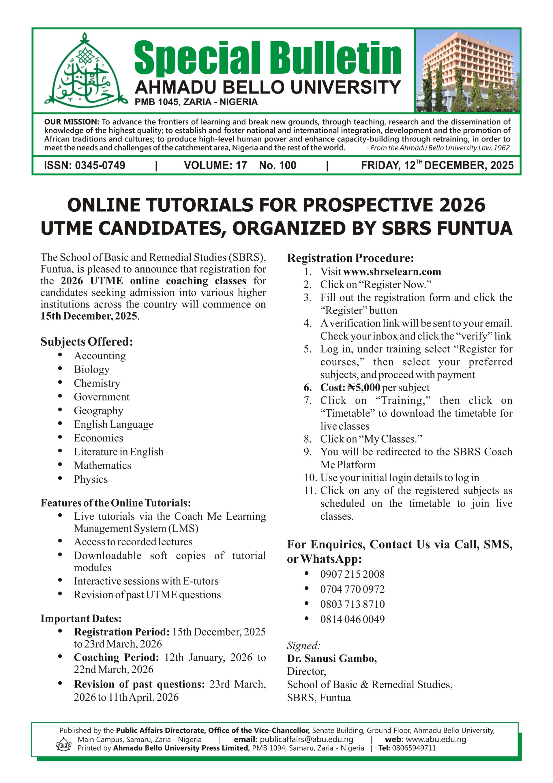 Special Bulletins Online Tutorials for Prospective 2026 UTME Candidates, Organized by SBRS Funtua December 12, 2025 Special Bulletins Re: Internal and External Advertisement for Academic and Non-teaching Staff Positions for 2025 December 5, 2025 Special Bulletins Distance Learning Centre Invigilation Application and Scheduling Portal December 2, 2025 Special Bulletins Screening of Newly Admitted Students for the 2025/2026 Academic Session November 28, 2025 Special Bulletins Call for Memoranda November 21, 2025
